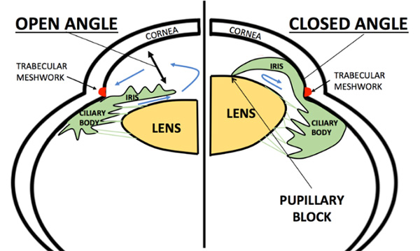 Angle Closure Glaucoma results from a narrowing of the angle between the iris and cornea. Angle closure glaucoma can be gradual and chronic, or it can be sudden and acute. In cases of acute angle closure glaucoma, (sometimes called a glaucoma attack, the IOP can become dangerously high, casing severe pain and rapid loss of vision.