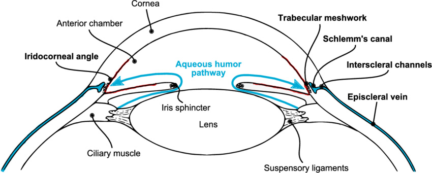 The eyeball continuously makes a clear fluid to maintain the eye pressure (called the aqueous humor or simply aqueous.) The aqueous is made by muscle tissue near the front of the eye called the ciliary body. The aqueous then flows through the pupil and filters out through the trabecular meshwork, eventually draining into the venous circulation.