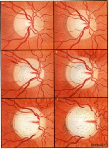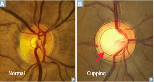 The change in the optic nerve head as a result of high IOP is called cupping. The optic nerve head changes shape with the central portion enlarging and bending backwards.